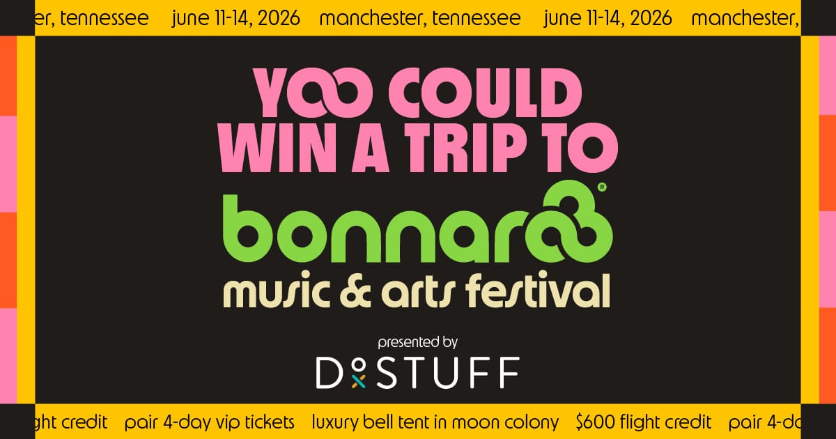 Win a Flyaway to Bonnaroo, June 11–14 in Manchester, TN. The prize includes two 4-Day VIP Tickets, a Luxury Bell Tent in Moon Colony, and a $600 flight credit. See Skrillex, The Strokes, RÜFÜS DU SOL, Noah Kahan, and more.*